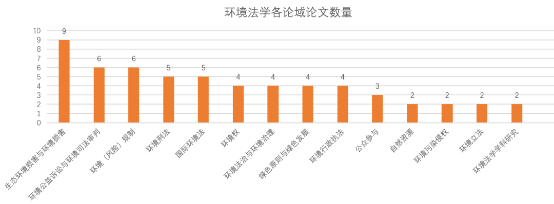根据2019年CSSCI(法学类)环境与资源保护法学论文研究领域分布情况,可以发现:生态环境损害与环境损害、环境公益诉讼与环境司法审判、绿色原则与绿色发展、环境刑法、环境权、环境法治与环境治理研究仍为环境法学研究重点和热点领域。