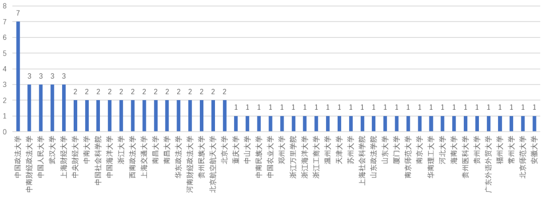 中国政法大学 7篇1.朱明哲:《生态文明时代的共生法哲学》,《环球法律评论》2019年第2期。2.于文轩:《生物安全风险规制的正当性及其制度展开——以损害赔偿为视角》,《法学杂志》2019年第9期。3.于泽瀚:《美国环境执法和解制度探究》,《行政法学研究》2019年第1期。4.林灿铃:《跨界突发性水污染国家责任构建》,《政治与法律》2019年第11期。5.林灿铃、杜彩云:《环境伦理之于国际环境法》,《比较法研究》2019年第6期。6.焦海涛:《环境保护与反垄断法绿色豁免制度》,《法律科学》2019年第3期。7.侯佳儒:《环境损害救济:从侵权法到事故法》,《政法论丛》2019年第5期。武汉大学 3篇1.秦天宝:《论国家公园国有土地占主体地位的实现路径——以地役权为核心的考察》,《现代法学》2019年第3期。2.刘静:《论生态损害救济的模式选择》,《中国法学》2019年第5期。3.陈海嵩:《我国环境监管转型的制度逻辑——以环境法实施为中心的考察》,《法商研究》2019年第5期。中南财经政法大学 3篇1.田国宝:《我国污染环境罪立法检讨》,《法学评论》2019年第1期。2.戚建刚、余海洋:《“雾霾应急的环境法理”之反思》,《法学论坛》2019年第5期。3.麻昌华、郭晓虹:《生态环境损害复合救济模式探析》,《法学杂志》2019年第3期。中国人民大学 3篇1.周珂:《我国环境立法价值与功能之方法论研究——兼论彭真环境立法方法论》,《政法论丛》2019年第5期。2.张翔、段沁:《环境保护作为“国家目标”——<联邦德国基本法>第20a条的学理及其启示》,《政治与法律》2019年第10期。3.樊勇:《私人自治的绿色边界——<民法总则>第9条的理解与落实》,《华东政法大学学报》2019年第2期。上海财经大学 3篇1.胡苑:《论威慑型环境规制中的执法可实现性》,《法学》2019年第11期。2.胡苑:《环境法律“传送带”模式的阻滞效应及其化解》,《政治与法律》2019年第5期。3.张锋:《我国协商型环境规制构造研究》,《政治与法律》2019年第11期。2019年各高校环境法学CSSCI(法学类)期刊论文发表详情:三、论文选题概况